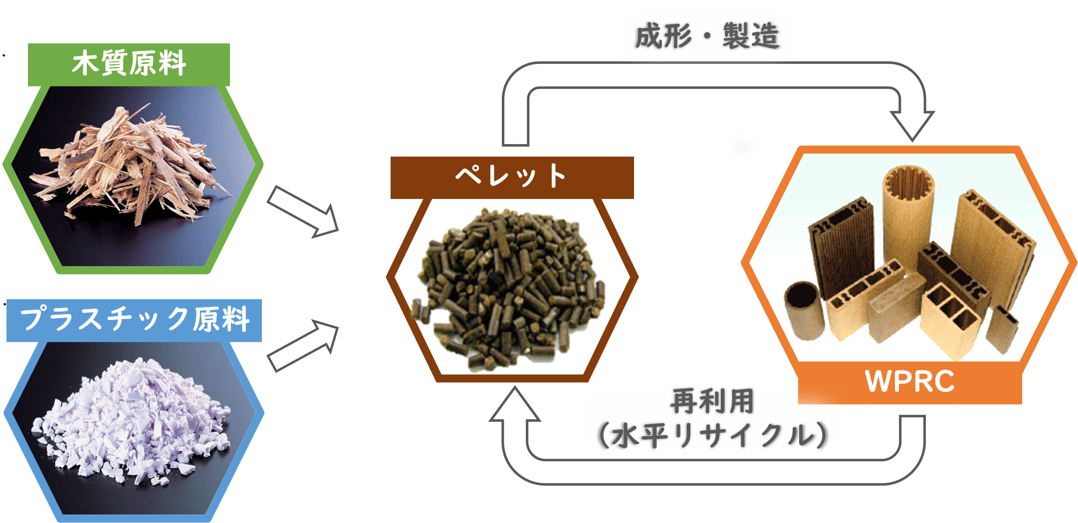 WPRCの主な原料は、廃棄物として発生した木質原料と産業廃棄されたプラスチック原料です。